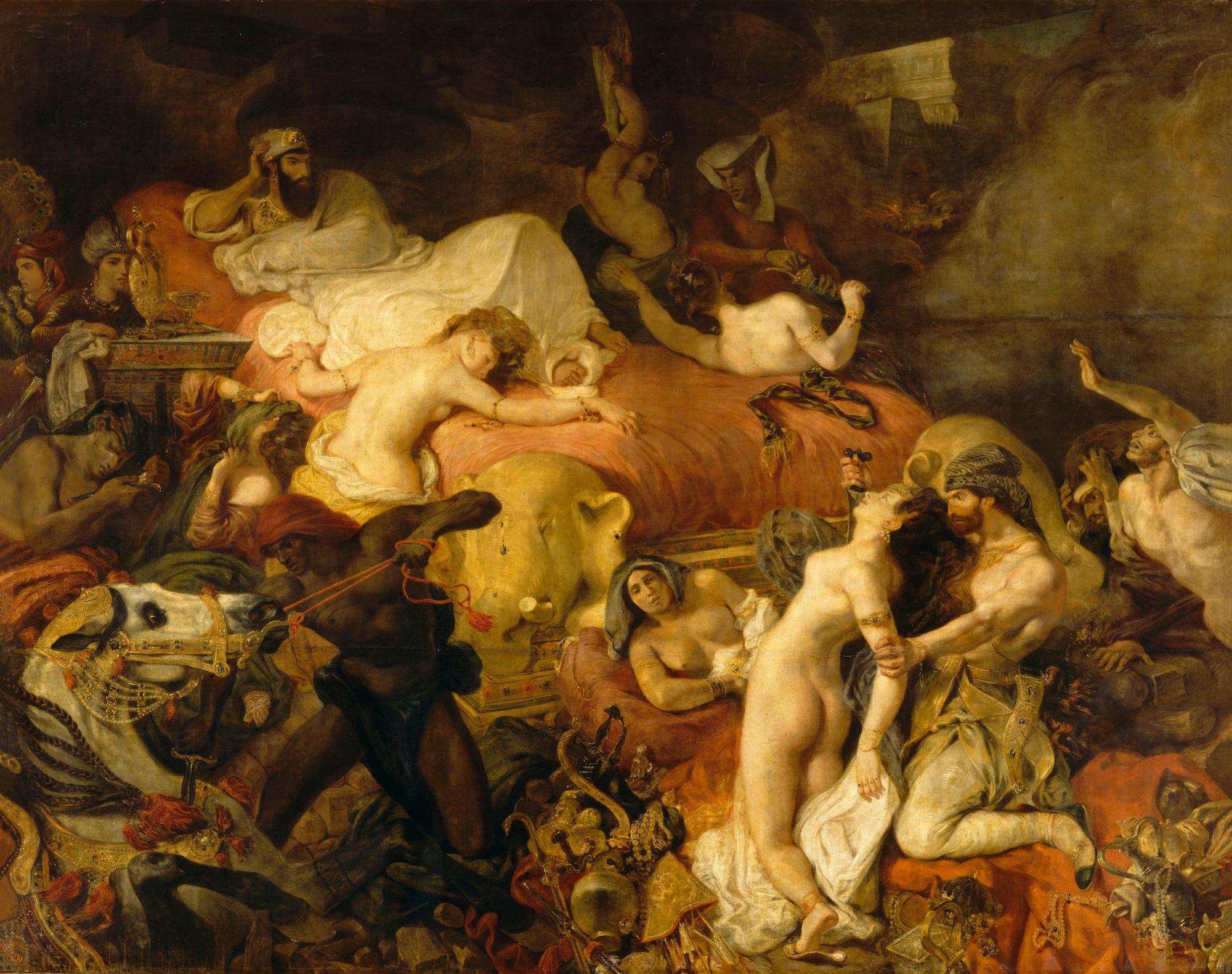 Delacroix, inspired by Byron's tragedy Sardanapalus, drew on a range of influences to produce this painting: ancient sources such as Diodorus of Sicily, contemporaries including Victor Hugo and Rossini, and less obvious influences such as Etruscan sculpture, Persian miniatures, and Indian customs. Byron merely hinted at the outcome of his play, which he dedicated to Goethe: besieged by his enemies in his palace, Sardanapalus committed suicide. Delacroix, however, imagined that the king also burned his worldly possessions and everything that had given him pleasure: women, pages, horses, dogs, and treasures. The painter gave expression to his idea through a personal style resulting from his prodigious pictorial culture, a blend of French, Flemish, Dutch, Italian, English, Oriental, classical, and modern influences.