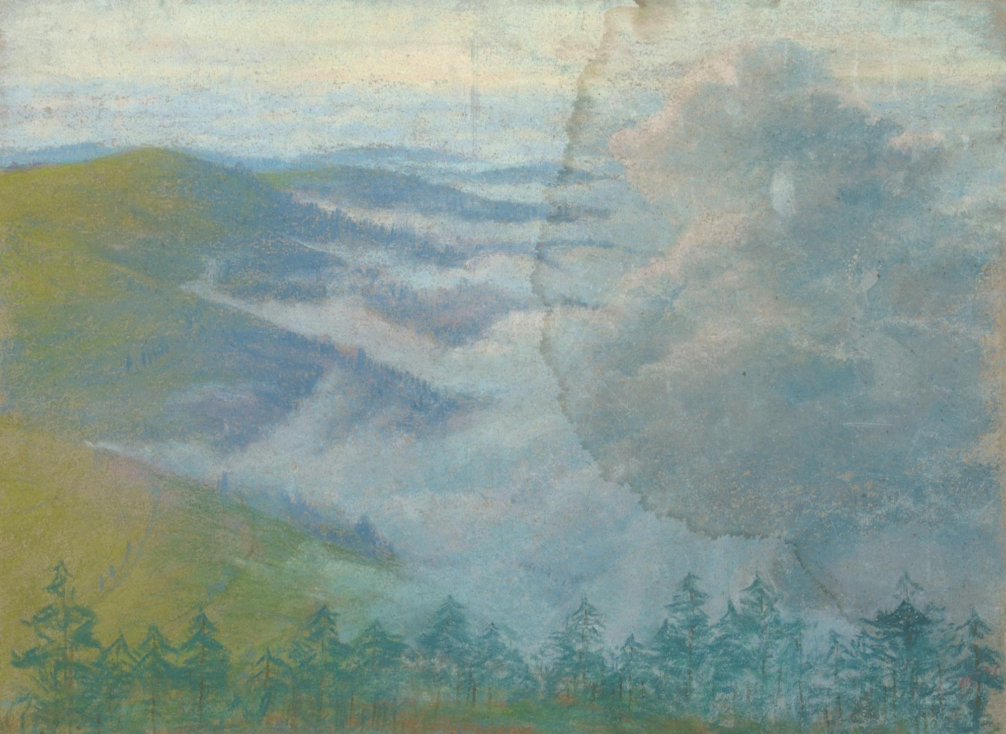 Museoteca - Paysage de montagne avec sapins au premier plan et brume, Garas Fran?ois