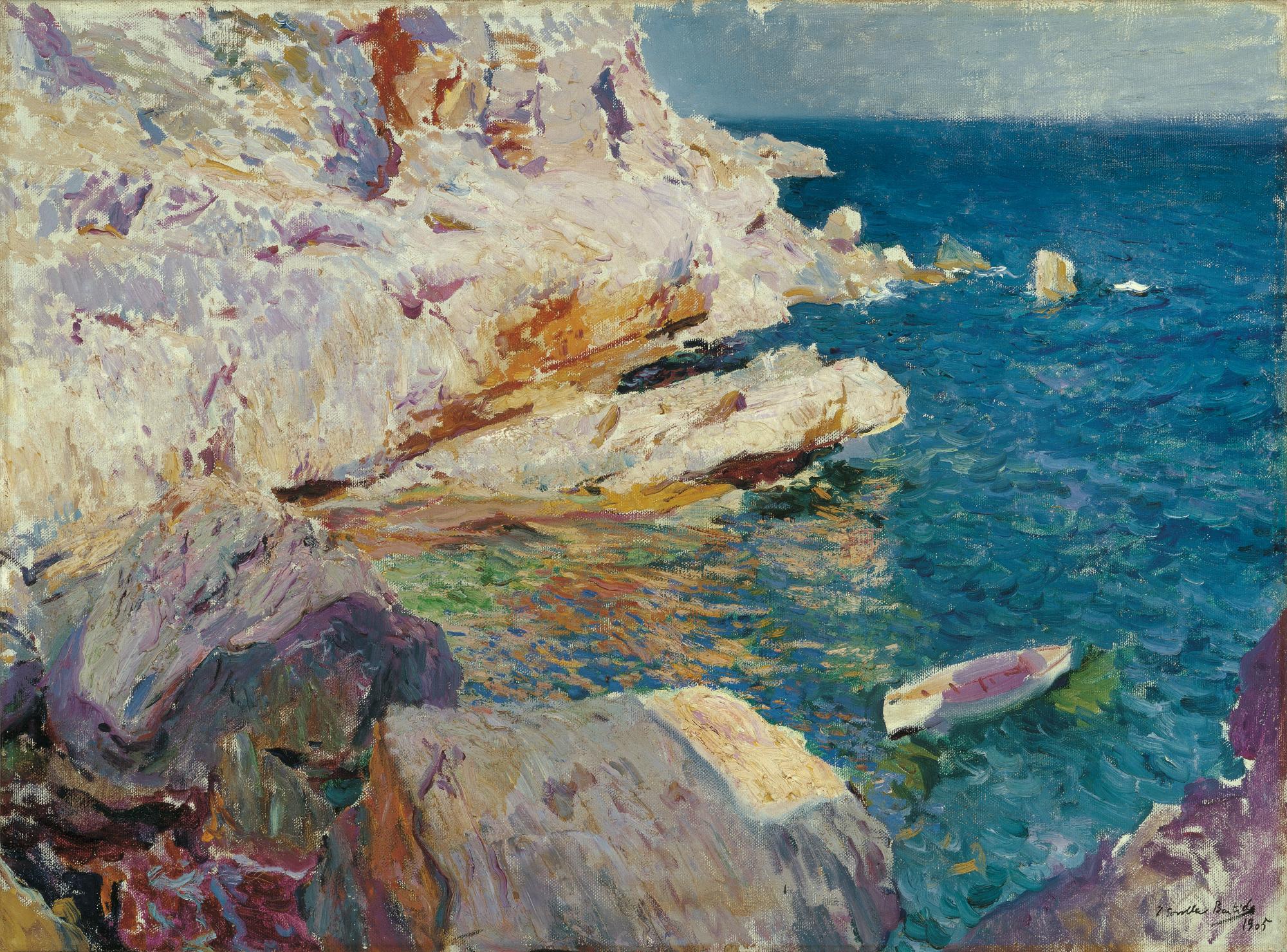 During that summer of 1905 he painted sixteen major works with the theme "sea and rocks". They are similar to this painting and their titles include:Rocks of the Cape. Jávea (New York, The Hispanic Society of America), Las rocas del cabo. Jávea ("The Rocks of the Cape. Jávea" ? Bayonne, Musée Bonnat), Reflejos del cabo. Jávea ("Reflections of the Cape. Jávea" ? private collection), and El bote blanco. Jávea ("The White Boat. Jávea" ? private collection). This last painting is very similar toRocks at Jávea. The White Boat, except that the angle precludes the inclusion of that powerful part of the coast formed by the spurs of the cape known as Cabo de San Antonio.