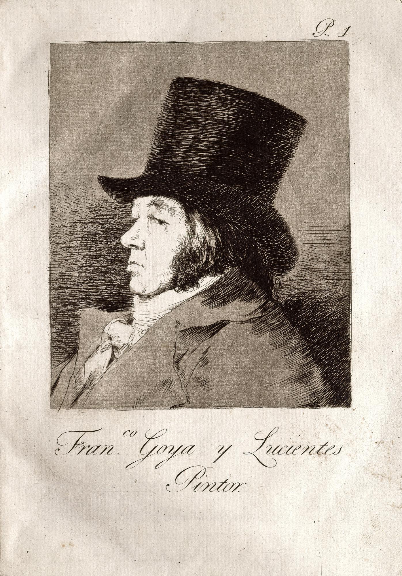 Goya, en está primera estampa de la primera edición de Los Caprichos, se retrató como autor de esta serie de sátiras sobre la sociedad española de su tiempo.