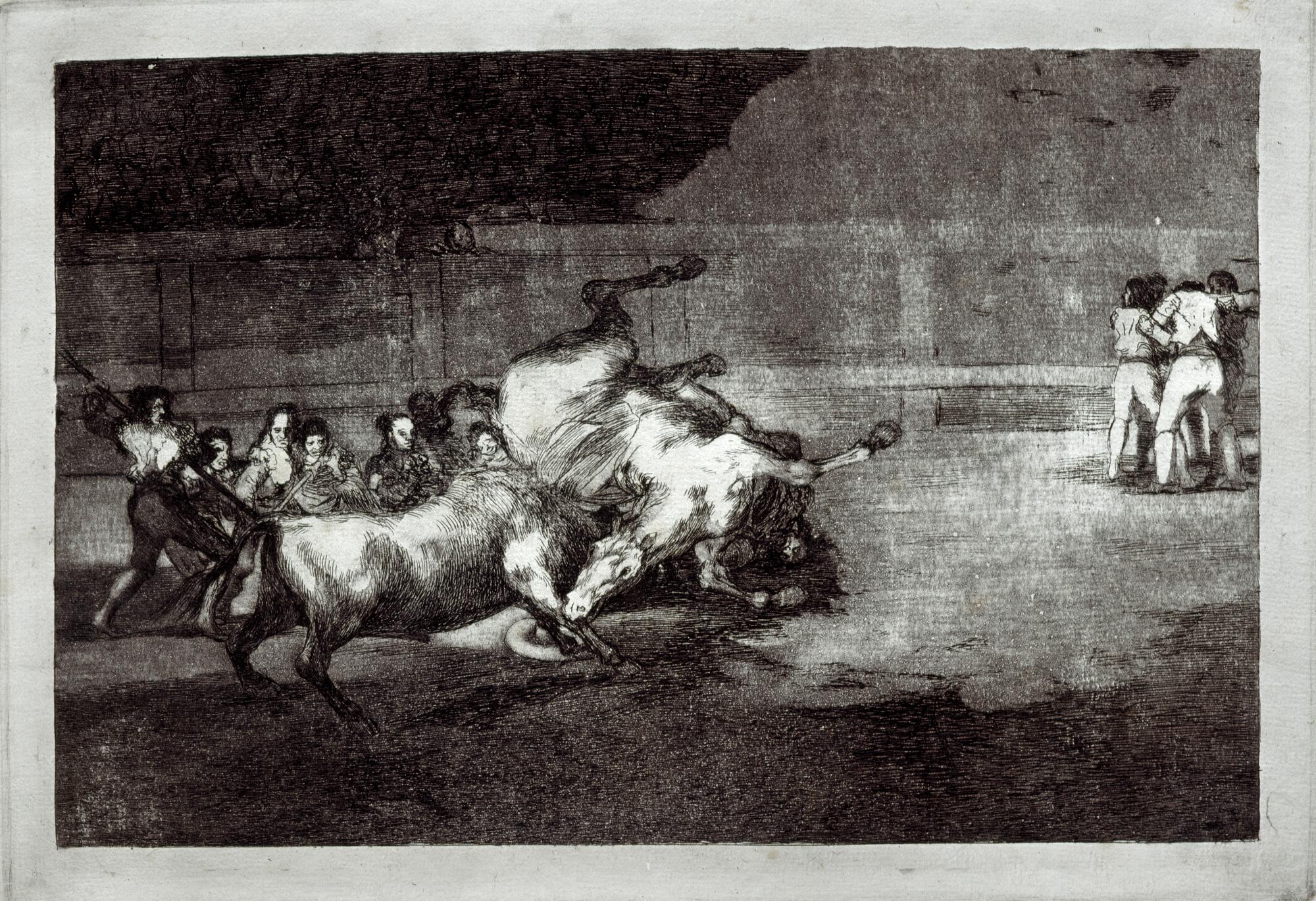 Prueba de estado. Una de las siete composiciones descartadas por Goya para su publicación en 1816, motivo por el que la Tauromaquia está compuesta por 33 estampas en lugar de 40.