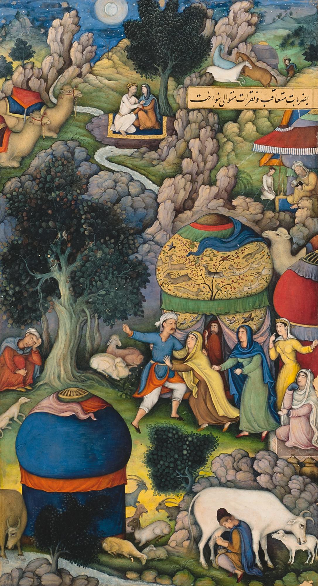 Under the patronage of the Emperor Akbar, miniature painting in Mughal India, and the associated arts of decoration and calligraphy, reached a high point. His court painters worked in the Persian tradition, but invested it with their own energetic Mughal style. Among the finest products of Akbar?s patronage is this superb manuscript (now disbound) of the Bah?rist?n (Garden of Spring), a fifteenth-century classic by the great Persian poet J?m?. The text was written in a beautiful nasta?l?q script by the great scribe Mu?ammad ?usayn, who held the title of Zar?n Qalam, or Pen of Gold. Specialist artists drew marginal figures, animals, birds and arabesques in gold outline on coloured paper. Illustrating scenes from the poem are six miniatures by the finest artists of the time.