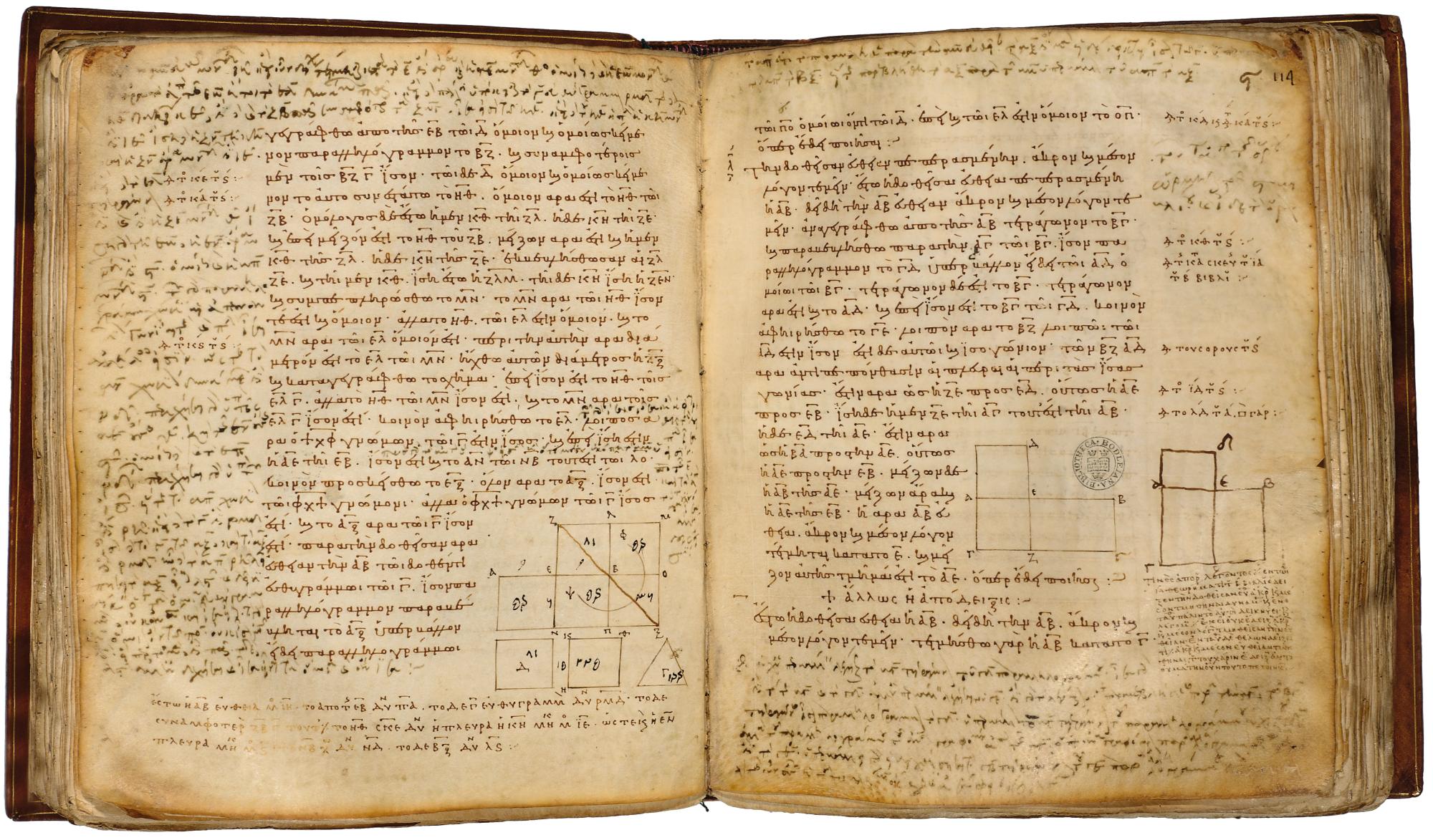 Euclid?s Elements was a standard mathematical textbook for more than two thousand years. This manuscript of the Elements was finished in September 888 by the scribe Stephanos Clericus, and was bought by Arethas of Patrae, Bishop of Caesarea. It is the oldest manuscript of a classical Greek author to bear a date, and the oldest surviving manuscript of the most widely studied version of Euclid ? by Theon of Alexandria. It is a product of the great revival of scholarship in ninth-century Byzantium, in which many classical Greek texts were copied and thereby preserved for future generations. The text is beautifully written in a newly introduced cursive minuscule and accompanied by precise line drawings. In the margins Arethas has written substantial annotations.