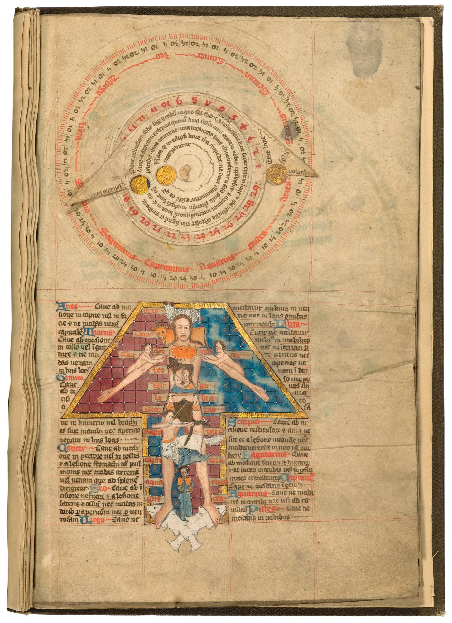 This manuscript contains the observational records of John Somer, a Franciscan friar associated with the Merton school of astronomy that flourished in fourteenth-century Oxford. His Kalendarium contains astronomical data covering the four Metonic (nineteen-year) cycles between 1387 and 1462. The data are presented in a series of tables and diagrams, and linked to saints? days. The inclusion of a traditional ?zodiac man? illustrates the inseparability, at that time, of astronomy, astrology and medical practice. The parts of the body were directly related to the heavenly spheres, and in the illustration the signs of the zodiac are superimposed on specific areas of the human figure. When the moon was in a particular sign, then blood should not be let from the corresponding part of the body. Using the turning disk (volvelle) above the zodiac man, a reader could calculate the longitude and phases of the moon at a particular time.