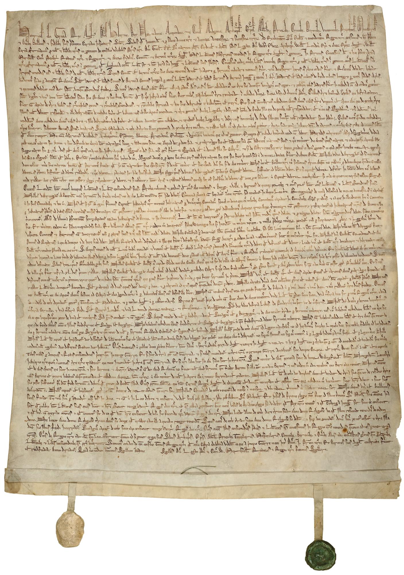Magna Carta (?the Great Charter?) was agreed between King John and his barons on 15 June 1215. It regulated the feudal customs of the kingdom, and has since become one of the great symbols of freedom and the rule of law. If there was a first, master charter to which King John put his seal in 1215, it has not survived. Instead there are a number of later ?engrossments? or exemplifications of the text, revised according the political priorities of the time, which were officially issued to English counties by the royal chancery. Some seventeen have survived, and their survival has ensured that Magna Carta is present in the imagination not only as a symbol of the rule of law, but also as a physical object which, much like the American Declaration of Independence, somehow embodies the spirit, or genius, of a nation.