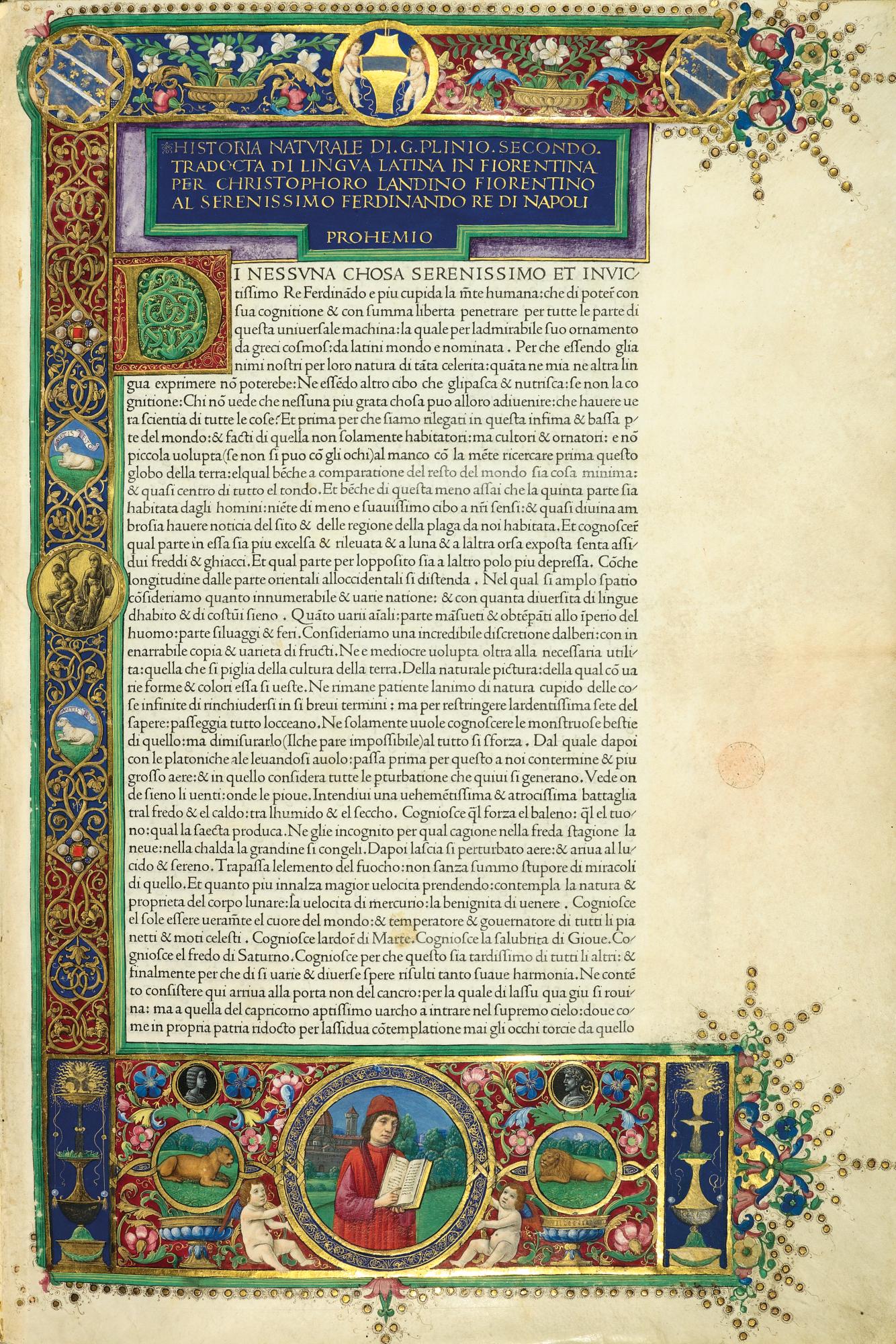 Pliny?s Natural History was an intellectual marvel in its day, and indispensable to later generations as an encyclopedia of antique knowledge of the natural world. It was also one of the first books to appear in print. The first translation of the Natural History into the vernacular was published by the Strozzi family of Florence in 1476. It was printed by Nicolas Jenson, the great Venetian printer, and this magnificent copy, on vellum, was specially illuminated for the banker Filippo Strozzi, who underwrote the edition. As well as an elaborate opening pages there are exquisite historiated initials and borders at the start of each of the thirty-seven books, many of them incorporating the Strozzi coat of arms, as well as hundreds of decorated initials within the text.