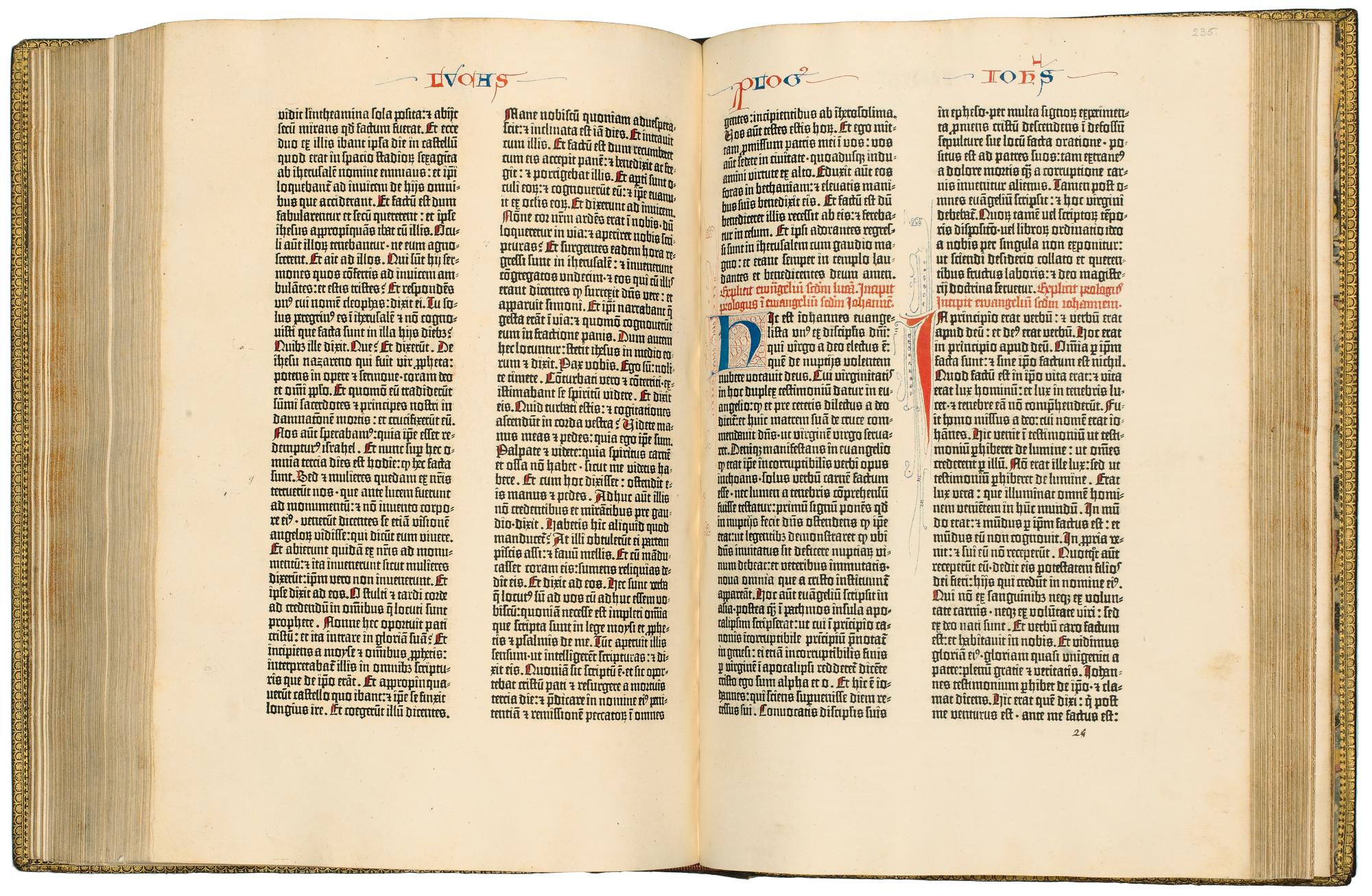 The Gutenberg Bible was the first substantial book to be printed in Europe. The printer after whom it is named, Johannes Gutenberg, was a citizen of Mainz in Germany. The Bible was probably intended for churches or monasteries, and despite the huge financial value of copies today, it was not intended to rival the most sumptuous illuminated manuscripts. The printing of the Gutenberg Bible was a turning-point in European culture, but what is truly remarkable is that the first large-scale printed book in Europe should also be one of the finest. When printed, the typeface produced black-and-white pages that are eminently readable and have an abstract beauty. The quality of the printing itself is uniformly high and the ink is a rich black. Rarely has a new technology been used with such sure-footed skill and artistry. Of the copies of the Gutenberg Bible that once existed, forty-eight survive reasonably intact today, twelve on parchment and the rest on paper. This copy is shown open at the beginning of St John?s Gospel.