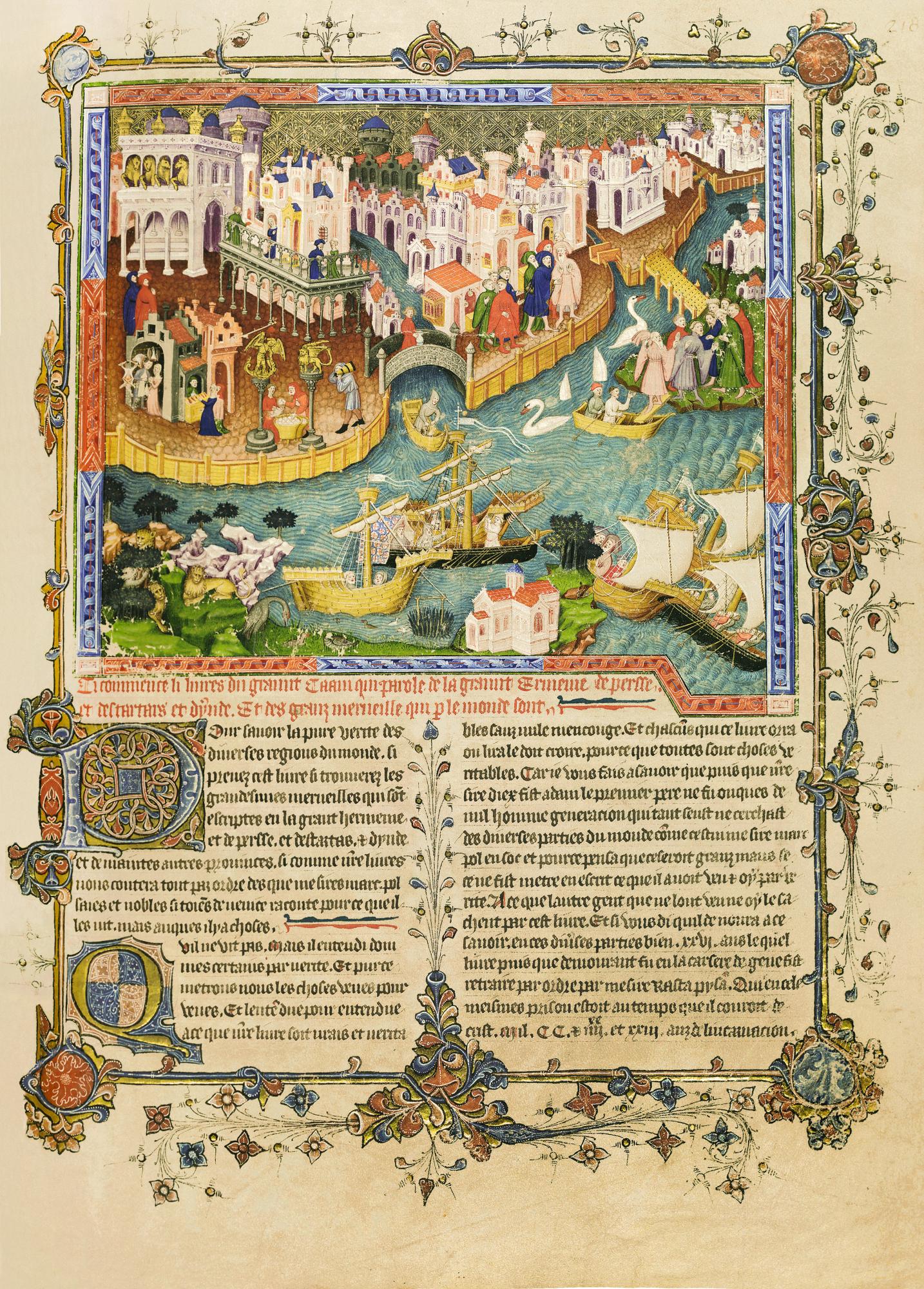 In his glorious frontispiece to a manuscript of Marco Polo?s Description of the World in French prose, the explorers leave Venice?s familiar sights as they set sail in 1271 towards the marvellous East.