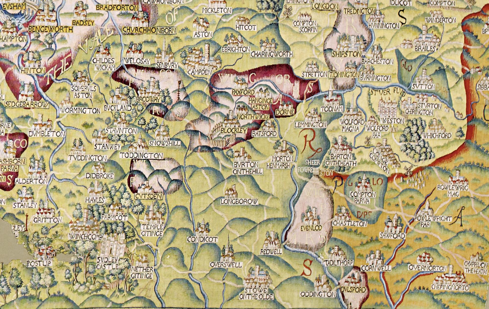 Owned by the Bodleian since 1809, the tapestry, woven in wool and silk, is a fine example of cartography and decorative art dating from the 1590s. This section features the northern Cotswolds from Evesham (top left) to Chipping Norton (bottom right). Prominent towards the right centre are the Rollright Stones and Four Shires Stone, both still visible in the landscape today. Weston House, where the tapestry was commissioned to be hung can be seen just above the Rollrights.
