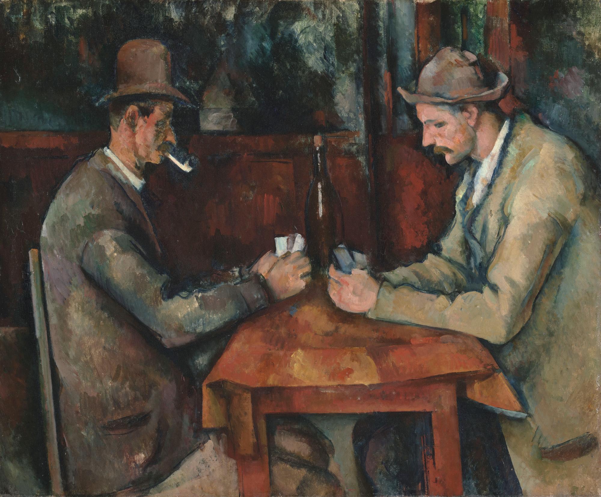 Cézanne had certainly seen The Cardplayers, attributed to the Le Nain brothers, at the museum in Aix-en-Provence, his home town. During the 1890s, the artist tackled this theme of Caravaggian inspiration on many occasions, and gave an exceptional gravity to the confrontation. Cézanne substitutes subtle gestures and glances with bulky figures and characters in silent concentration.
