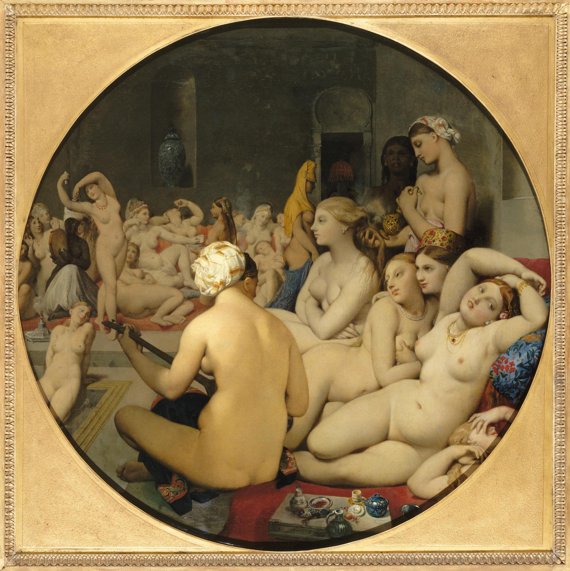 Decenas de mujeres turcas desnudas están sentadas o tumbadas en sofás en varias poses, en un interior oriental que está dispuesto alrededor de una piscina. Muchos de estas bañistas acaban de salir del agua y se estiran o se quedan dormidas; otras están charlando o tomando café. En el fondo, una mujer está bailando, mientras que en el primer plano otra, de espaldas a nosotros, es la toca música en una especie de laúd. El principal elemento de erotismo en la pintura se centra en dos mujeres, una de las cuales está acariciando el pecho de otra sentada a su lado. Esta imagen, que data de 1862, combina dos temas que habían sido los favoritos de Ingres durante más de cincuenta años: el desnudo y el Oriente.