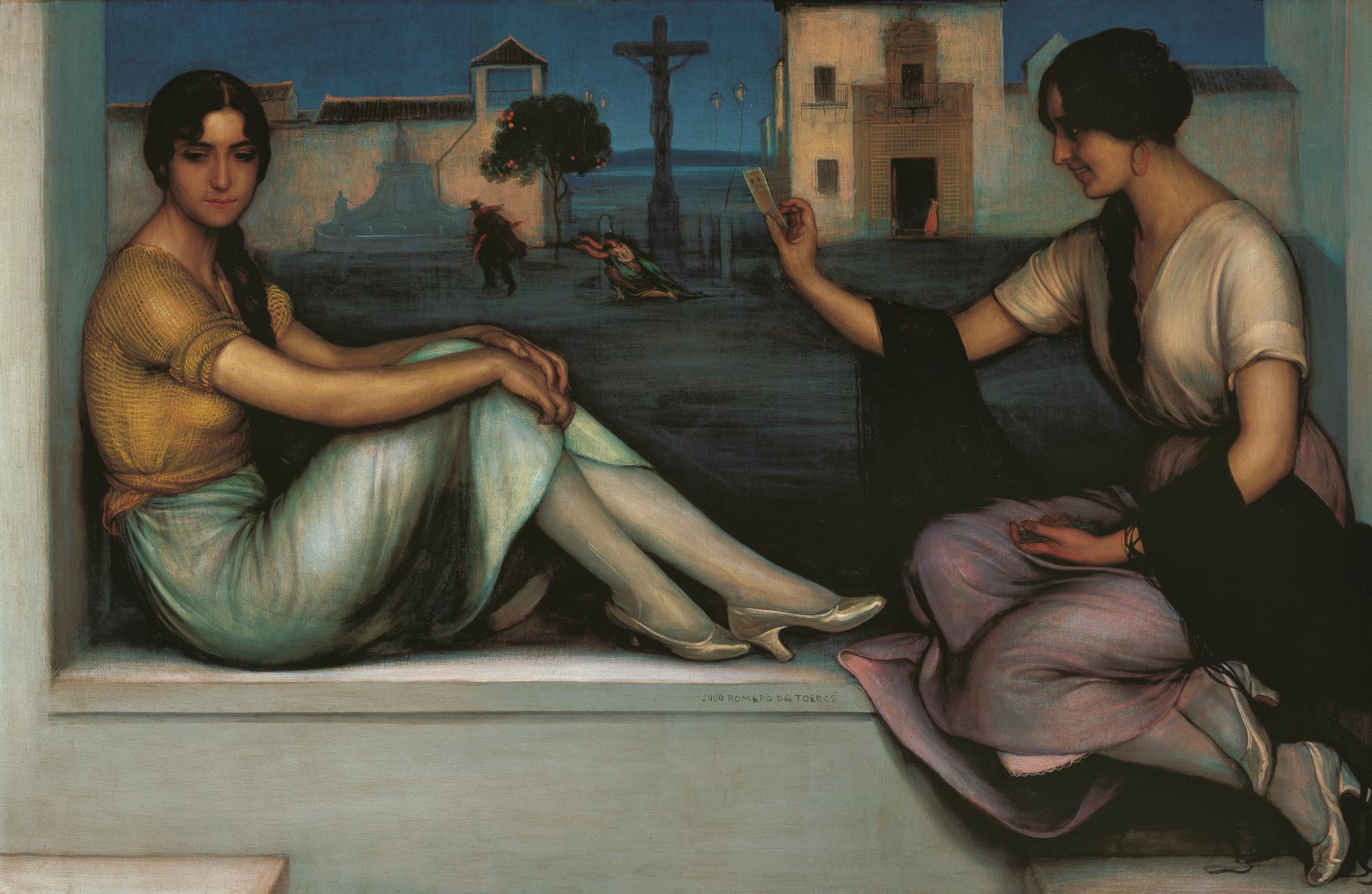 Sobre el alfeizar de una ventana, dos mujeres sentadas de perfil y con similar protagonismo, simbolizan la dualidad tantas veces presente en sus pinturas. A la derecha, una de ellas, con atuendo popular y las piernas recogidas hacia atrás, no parece que consiga atraer la atención de la otra joven que descansa sobre el propio alfeizar, mientras su gesto denota una manifiesta melancolía que trasluce una preocupación amorosa. Tras ellas, Córdoba, representada ahora por la casa y fuente de la Fuenseca, el Cristo de los Faroles y el palacio del Marqués de la Fuensanta del Valle, en cuya puerta aparece una mujer envuelta en un mantón rojo y recostada en el quicio.Alinea, como telón de fondo, los edificios y el monumento, sin importarle que en realidad se encuentran muy alejados entre sí.