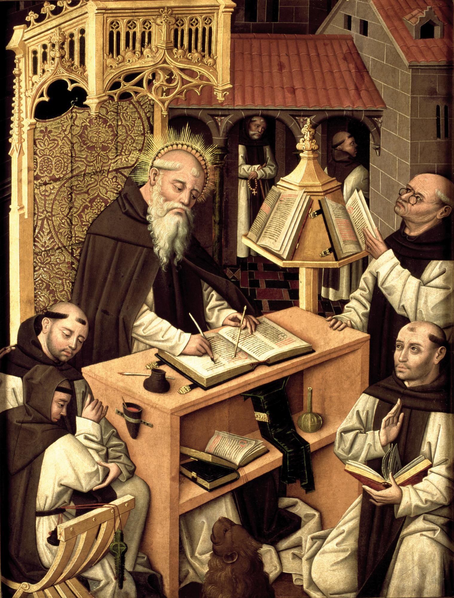 En este pintura procedente del Monasterio de San María del Parral, Segovia, se muestra el interior de un scriptorium medieval donde San Jerónimo está escribiendo la Vulgata (Biblia escrita en latín corriente con el fin de ser más comprensible).