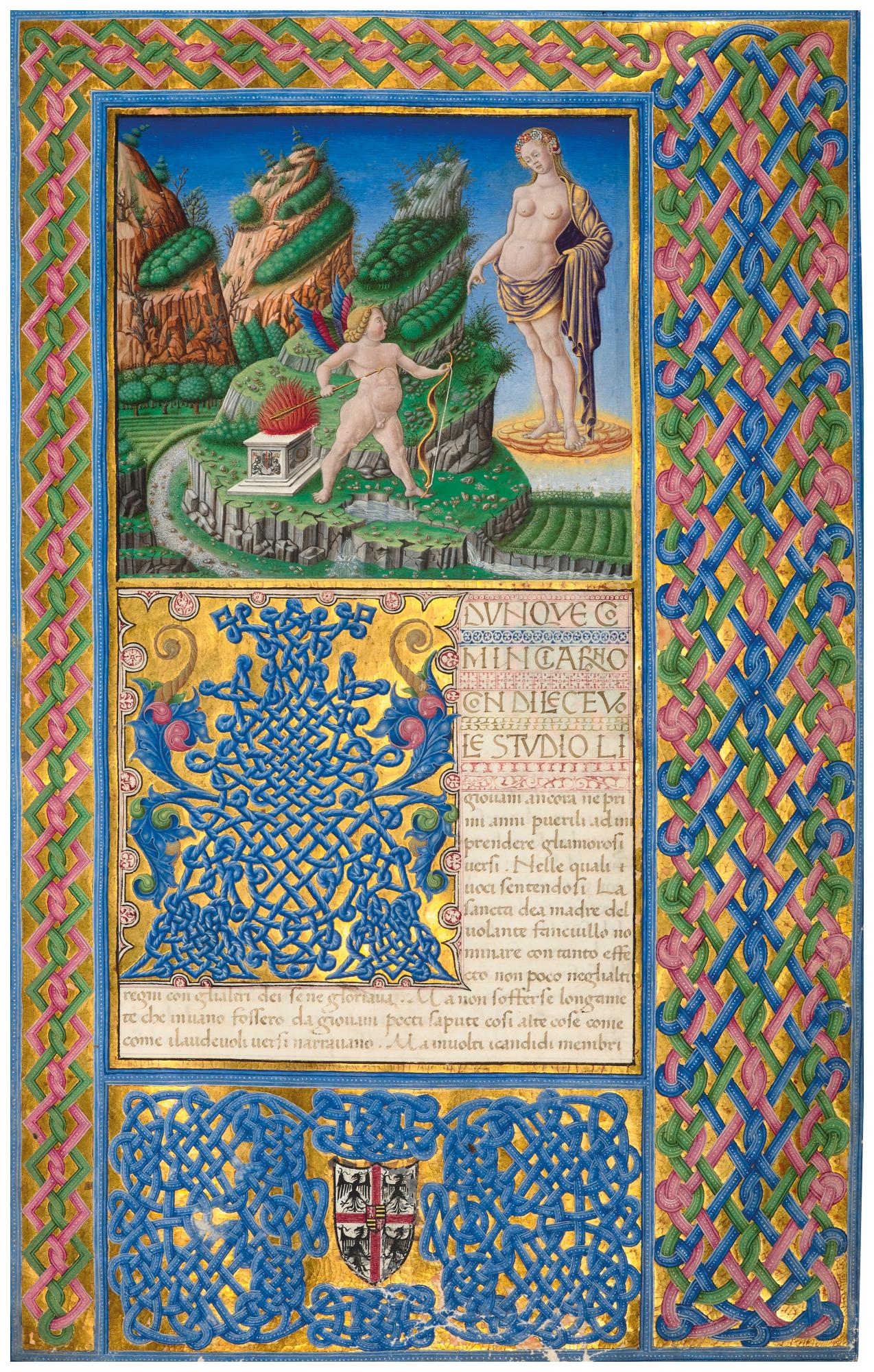 This manuscript of Boccaccio?s early tale is a product of the court of Ludovico Gonzaga, the marchese, or duke, of Mantua from 1444 to 1478. Each of the five books is headed by an exquisitely painted miniature. They are set within superbly drawn interlace borders on a gold ground, probably the work of another artist. There are also smaller initials within the text, marking chapter openings or major speeches. The miniatures do not elucidate (or even show much knowledge of) Boccaccio?s text, but give a courtly romance a classical flavour. In the miniature shown here a statuesque Cupid tempers his arrows in the stream running through the foreground. From a cloud his mother, Venus, gives him instructions while his altar burns behind him.