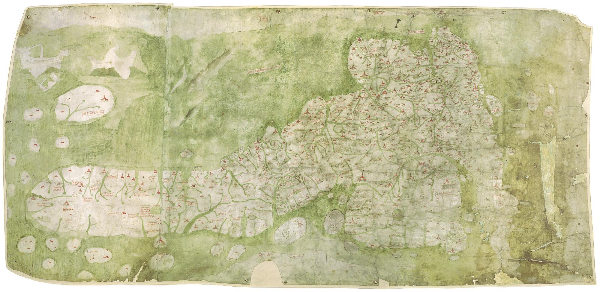 When this map is turned 90 degrees in a clockwise direction its shape immediately becomes familiar: it is the earliest surviving map to show the coastline of Britain in a recognizable form. As an example of cartography the Gough Map (named after a former owner, the antiquary Richard Gough) is a remarkable achievement; it served as the blueprint for similar maps for over two centuries, and was well known both at home and abroad. It is a rich source of historical information, but because the circumstances of its making are so obscure, it raises as many questions as it answers. When and where was the map made? Is it an original map, or was it derived from a lost earlier map? Does the map show signs of revision? Many of the settlements identified on it are linked by a series of straight red lines, which provide information on the distances between them and appear to be associated with particular itineraries, but what is their exact purpose? The fact that a number of the key settlements of the time are not linked in this way adds to the mystery. What, indeed, was the overall purpose of the map itself?