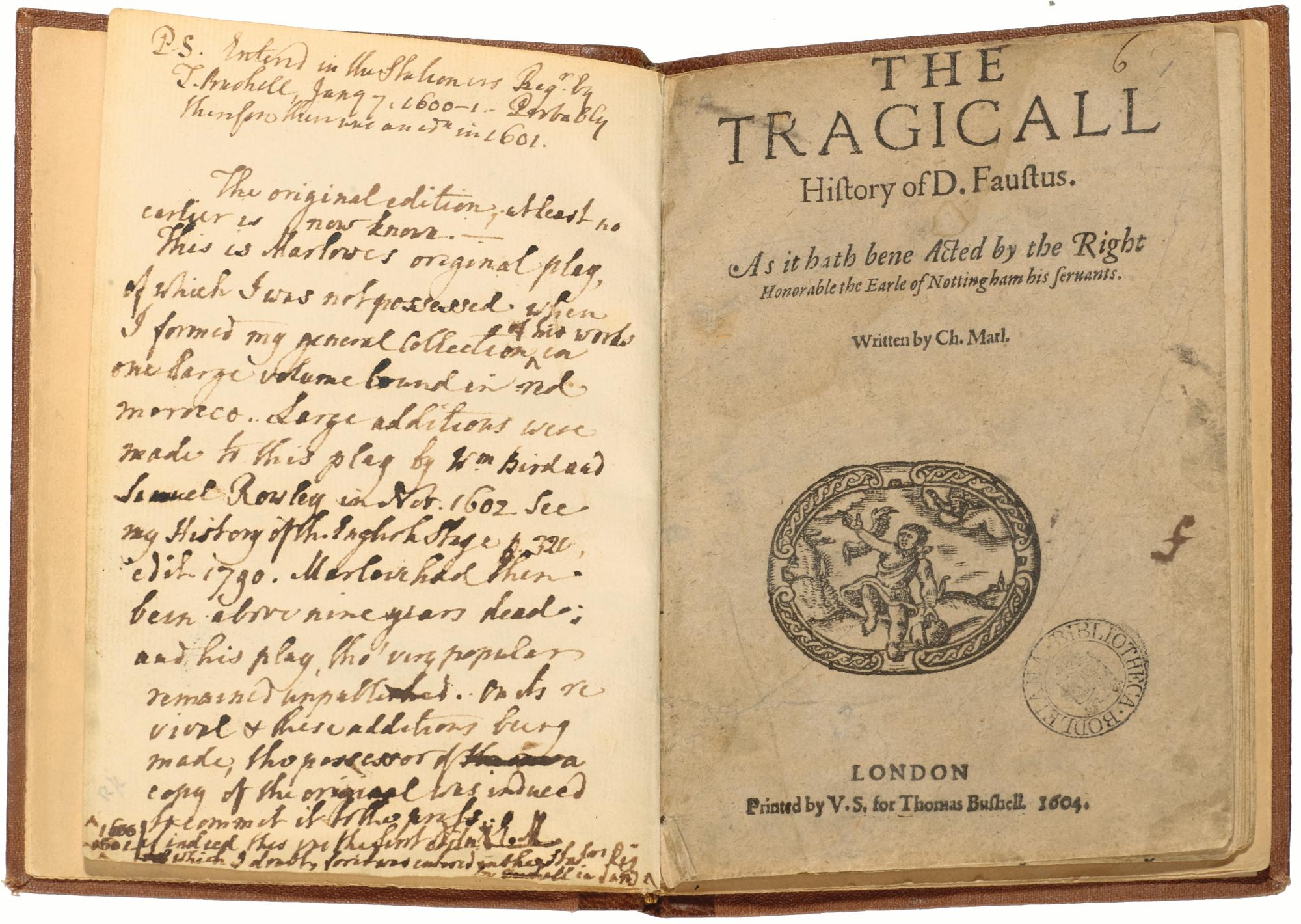The earliest documented performance of Christopher Marlowe?s Dr Faustus was given by the Earl of Nottingham?s company, the Lord Admiral?s Men, a year after Marlowe?s death in 1593. It remained a part of their repertoire until 1597. The earliest edition of the play to have survived was printed in 1604. This is the only known copy. It came to the Bodleian as part of the collection of the Shakespeare scholar Edmond Malone, who was the first person to appreciate the textual importance of these fragile books and therefore the first person to collect them. He has made some notes opposite the title page.
