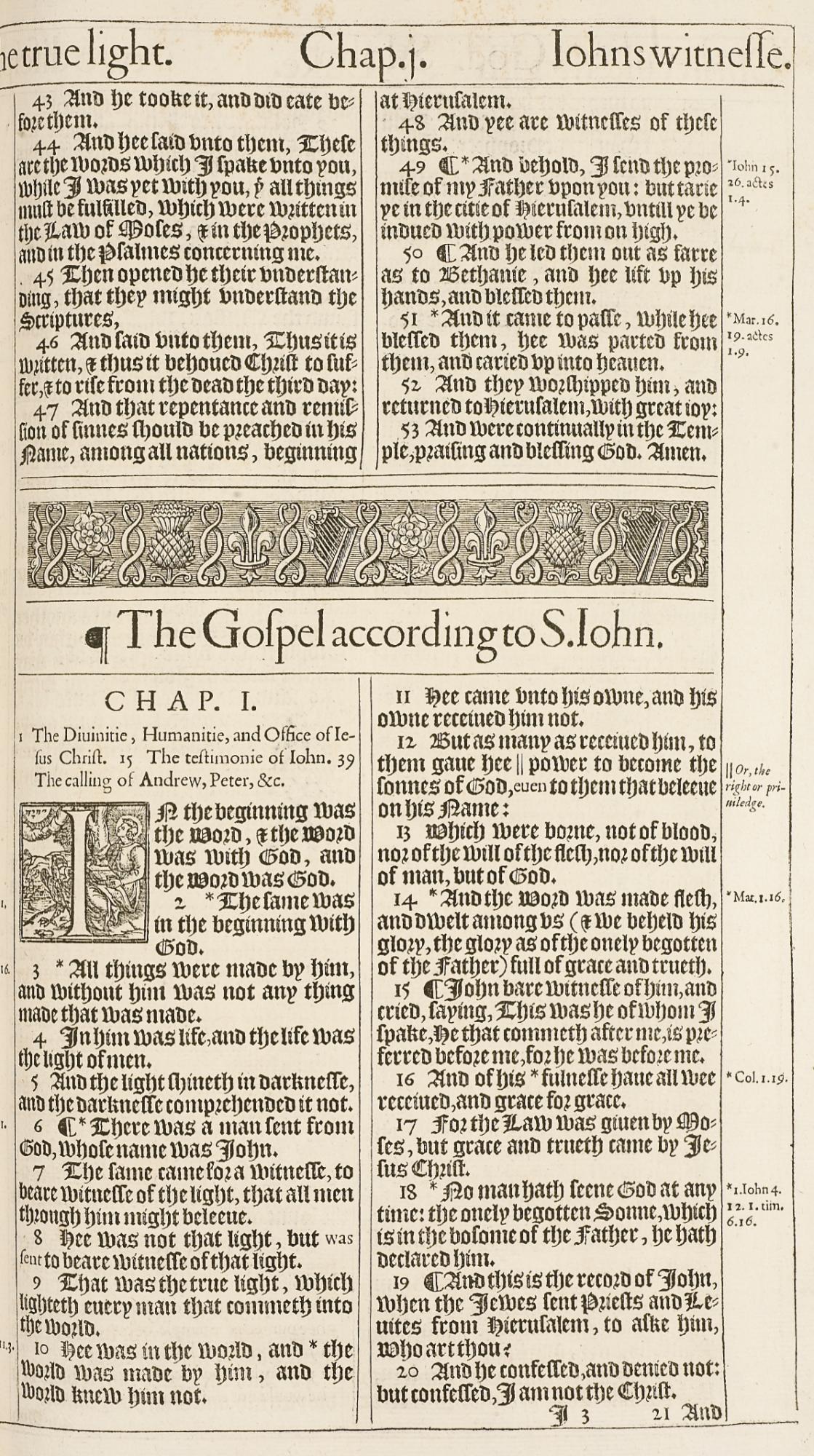 The beginning of the Gospel According to St John, in the 1611 King James Bible translation, printed by the King?s Printer, Robert Barker. The large format, ornaments, decorated capitals and black-letter type used for the edition lend an air of grandeur and authenticity to the Bible intended to be read in churches.