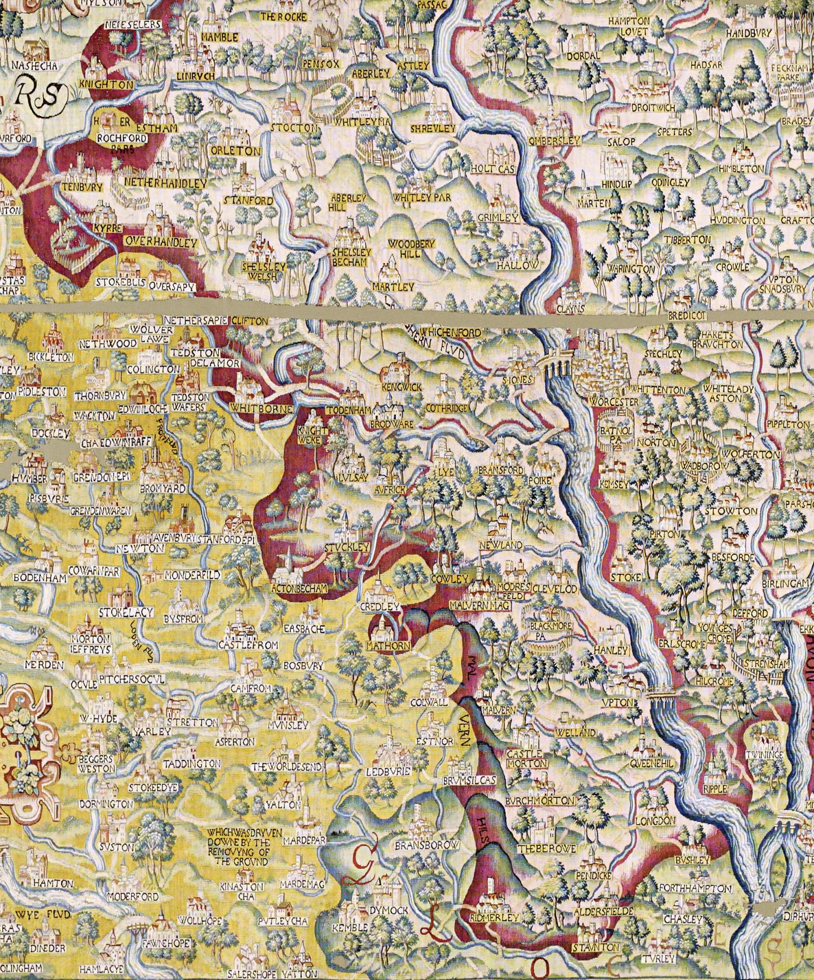 Owned by the Bodleian since 1809, the tapestry, woven in wool and silk, is a fine example of cartography and decorative art dating from the 1590s. This section features south-west Worcestershire and eastern Herefordshire, with the Malvern Hills and River Severn running north-south. Worcester can be seen towards the top right and the 1575 Kynaston landslide is described towards the bottom left.