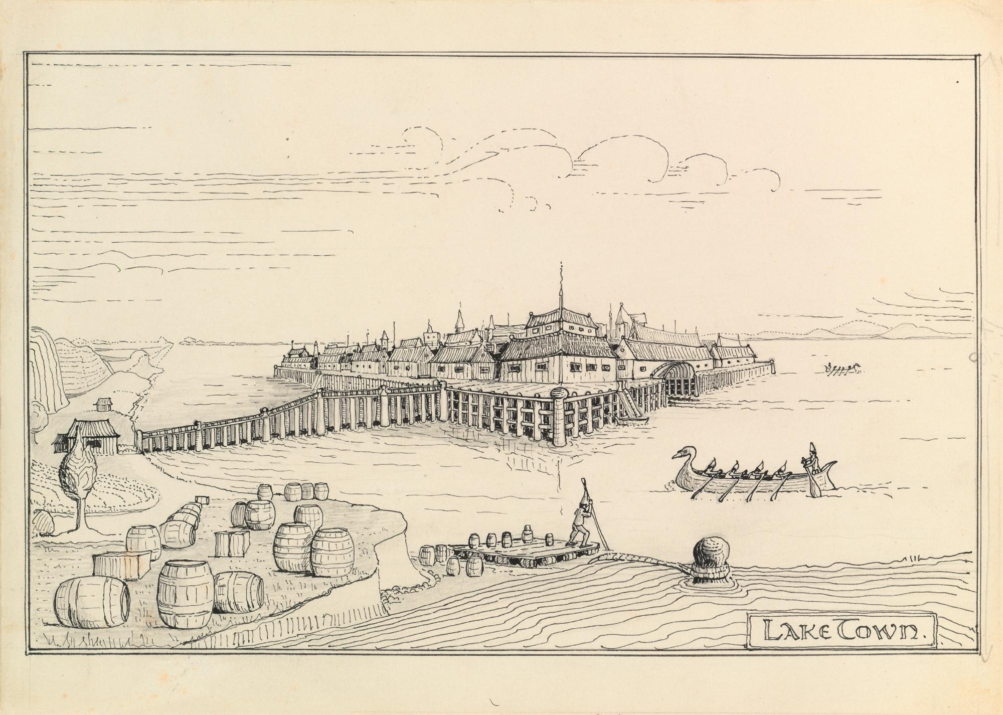 'Not far from the mouth of the Forest River was the strange town he heard the elves speak of in the king's cellars. It was not built on the shore, though there were a few huts and buildings there, but right out on the surface of the lake, protected from the swirl of the entering river by a promontory of rock which formed a calm bay. A great bridge made of wood ran out to where on huge piles made of forest trees was built a busy wooden town, not a town of elves but of Men, who still dared to dwell here under the shadow of the distant dragon-mountain.'