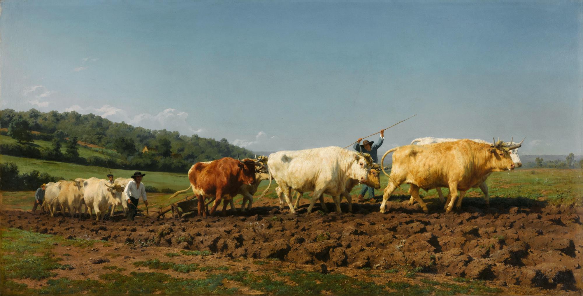 Todo el interés se concentra en el tiro del primer plano, sobre estos bueyes del Charolés-Nivernés cuyo pelaje claro, rojizo y blanco, está realizado por la luz fría y clara que envuelve toda la escena. Se trata en primer lugar de una escena de animales, cuyos héroes son los mismos bueyes, dejando poco espacio al hombre: el ganadero parece bastante pequeño en este lienzo. Es un himno a la labor campestre cuya grandeza está todavía más magnificada que resulta fácil de oponerlo, en estos días que siguen la revolución, a las infamias de la ciudad. También es un reconocimiento de la provincia, aquí el Nivernés, de sus tradiciones agrícolas y de sus paisajes.