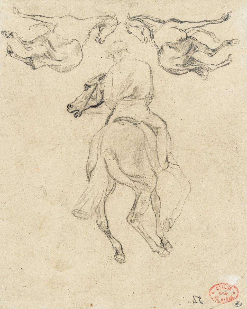 Jockey à cheval, vu de dos, et deux chevaux