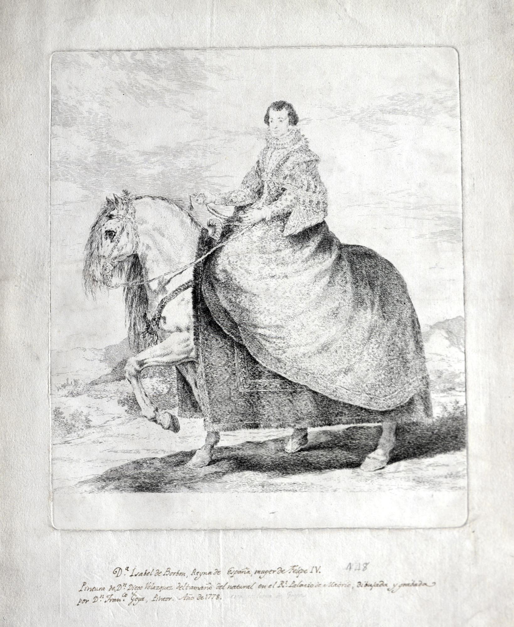 Prueba de estado, con texto manuscrito por Goya, para la estampa de la reina Isabel de Borbón que forma parte de la serie de grabados Copias de las pinturas de Velázquez