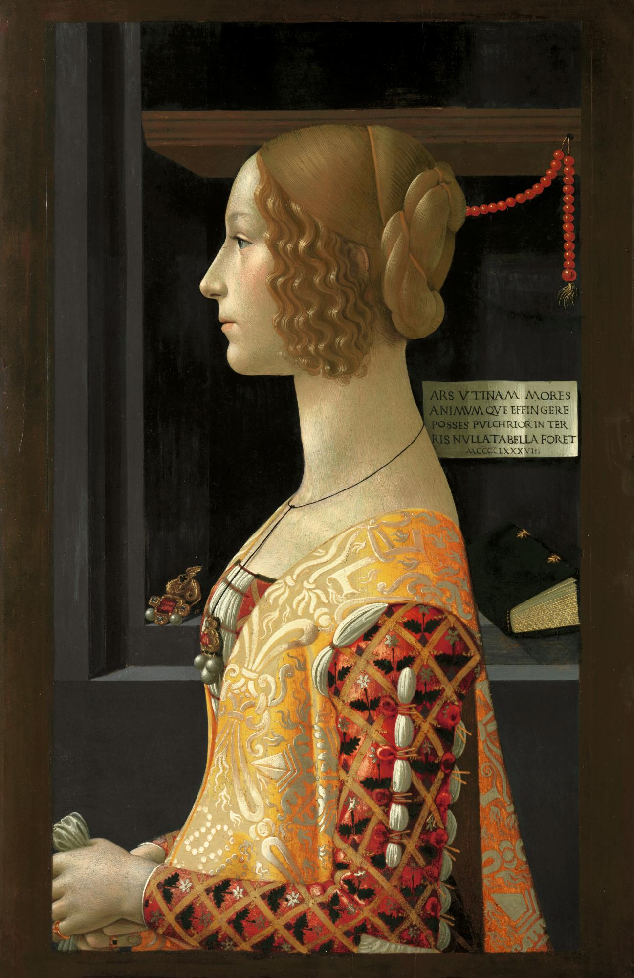 Cette image est un exemple classique du portrait Quattrocento florentin dans lequel le sitter pose debout, de profil strict et bustlength avec les bras en repos et les mains jointes. Dans le visage et le corps les caractéristiques et les proportions sont idéalisée. Dans le présent exemple, ce qui est évident à la fois dans les lignes qui créent le cou mince et la forme du corps et dans les traits inexpressifs et parfaites. Comme dans d'autres portraits de cette période, l'idéal de beauté utilisé pour dépeindre Giovanna Tornabuoni est basée sur des principes et des exemples tirés de l'antiquité classique théoriques, que les artistes de cette date ensuite combinées avec les caractéristiques individuelles de l'sitter particulier.