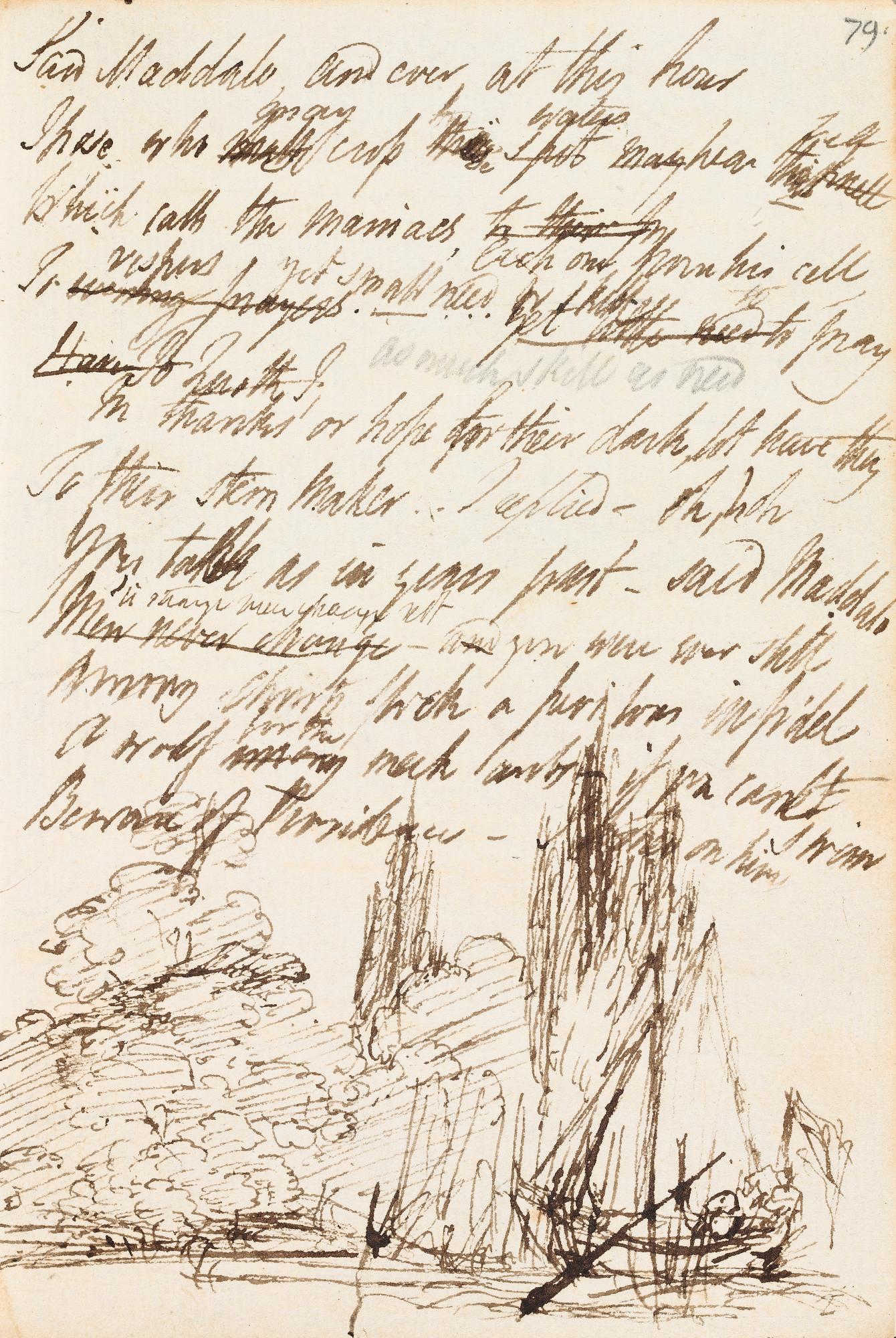 Shelley?s notebooks show him disciplining and shaping his thoughts to create highly crafted poetry and prose. Mixed up with literary composition are reading notes, memoranda, draft letters, accounts and the numerous doodles ? typically of trees or sailing boats ? that Shelley habitually drew during intervals of thought. After the poet?s death in 1822 Mary Shelley used the notebooks for her editions of his poetry and prose. On her death they took their place in the ?sanctum? her daughter-in-law, Jane, Lady Shelley, created at the family home, Boscombe Manor. This notebook contains Shelley?s original draft of ?Julian and Maddalo?. The poem was written while he was living at Venice near Lord Byron, and is an exploration of their conversations and contrasting opinions of human nature.