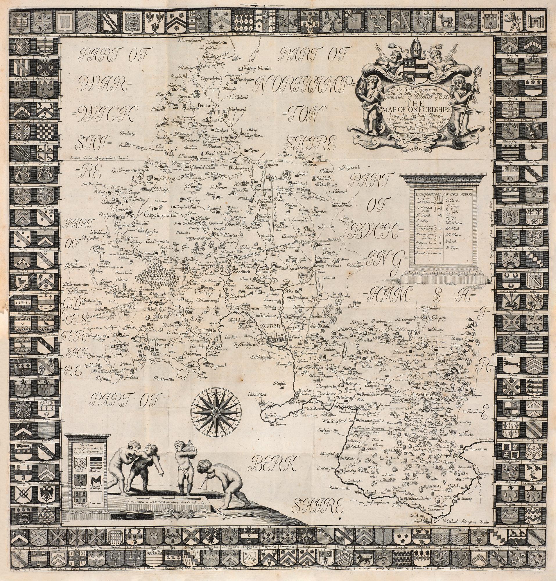 Robert Plot produced this map of Oxfordshire to accompany his highly regarded work on the natural history of the county. The map is clear, accurate, and relatively detailed for its scale, showing a few roads at a time when many county maps did not; it was engraved by Michael Burghers.