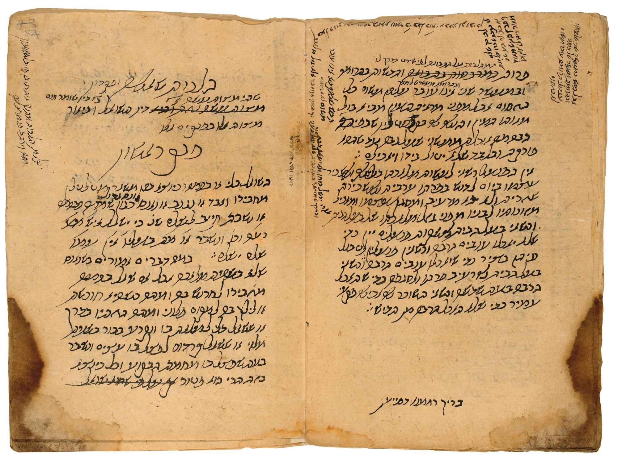 Moses Maimonides was the greatest Jewish scholar of the Middle Ages. As a rabbinic authority, his finest achievement was the Mishneh Torah or Repetition of the Law. Completed in 1180, it is a classification by subject matter of the entire talmudic and post-talmudic literature of Jewish law. This manuscript fragment contains drafts, in Maimonides? own hand, of parts of the Mishneh Torah: the end of the section on Laws of Hire and the beginning of the section on Laws of Borrowing and Deposit. It came to light in the 1890s with the discovery of the Cairo Genizah. A genizah is a special chamber attached to a synagogue where discarded pages containing the name of God were stored, to protect that name from profanation.