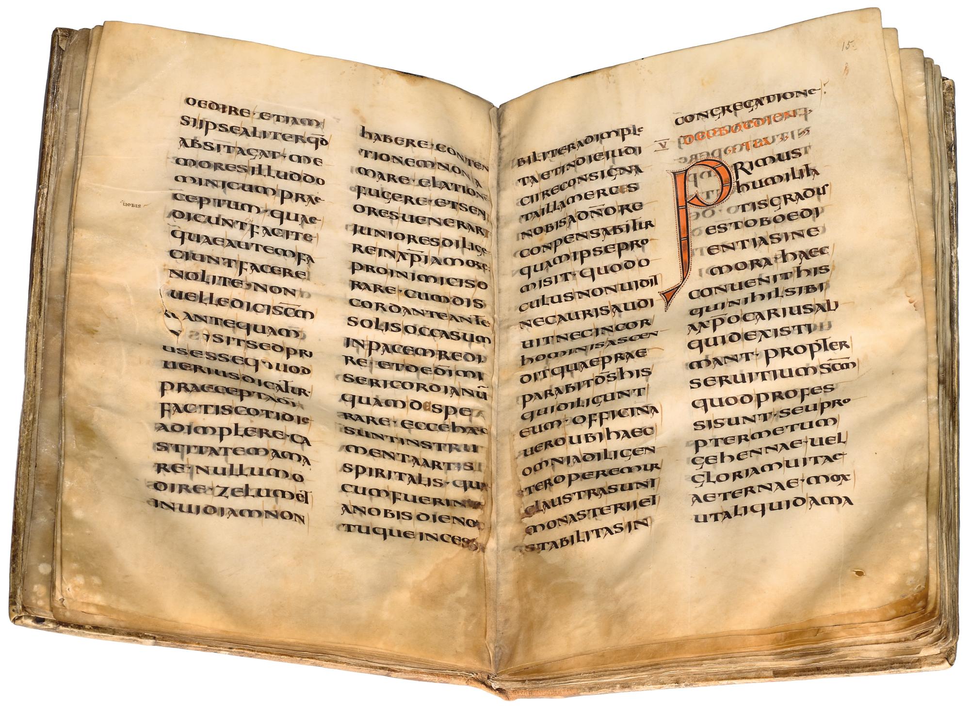 St Benedict of Nursia put together his Rule for monks in about 540. It spread to become the principal monastic code of Western Europe, and both eloquently expresses the principles of monastic life and provides a practical guide to daily observance. This is the earliest surviving manuscript of the Rule. It was made in England around AD 700 and is of the highest quality. The origins of the manuscript are obscure, although the beauty of the script and the generous use of the parchment, an expensive material, indicate a wealthy patron. St Benedict?s Rule was yet to establish itself fully in the country, so perhaps the manuscript was intended to promote its status and to provide an authoritative version of the text.