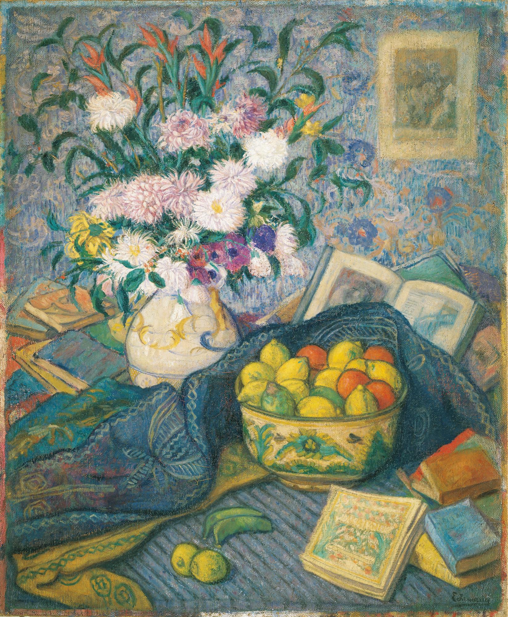 Title: Vase with bananas, lemons and books