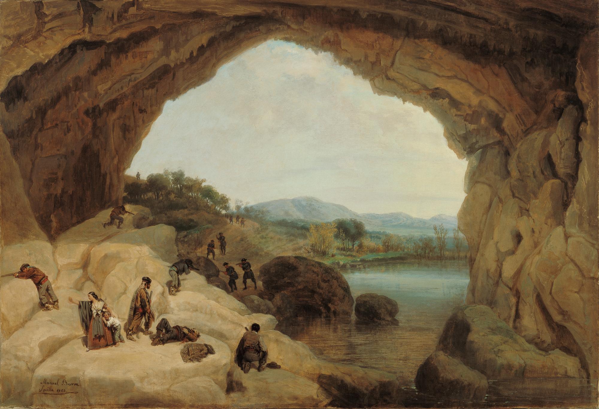 Beneath the imposing ceiling of the cave?s entrance, a group of bandits face an ambush laid for them by several civil guards who approach from a nearby hill firing their guns. The bandits on the rocks defend themselves with their blunderbusses from the guards? attack. One lies wounded on the ground, while a tearful child, startled by the sound of the gunshots, clings to his mother, who begs for a ceasefire.