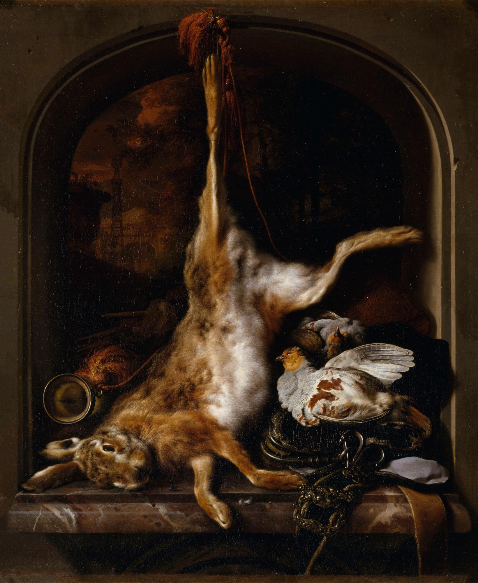 Museoteca - Gibier et ustensiles de chasse disposés sur le rebord d'une fenêtre, Weenix Jan