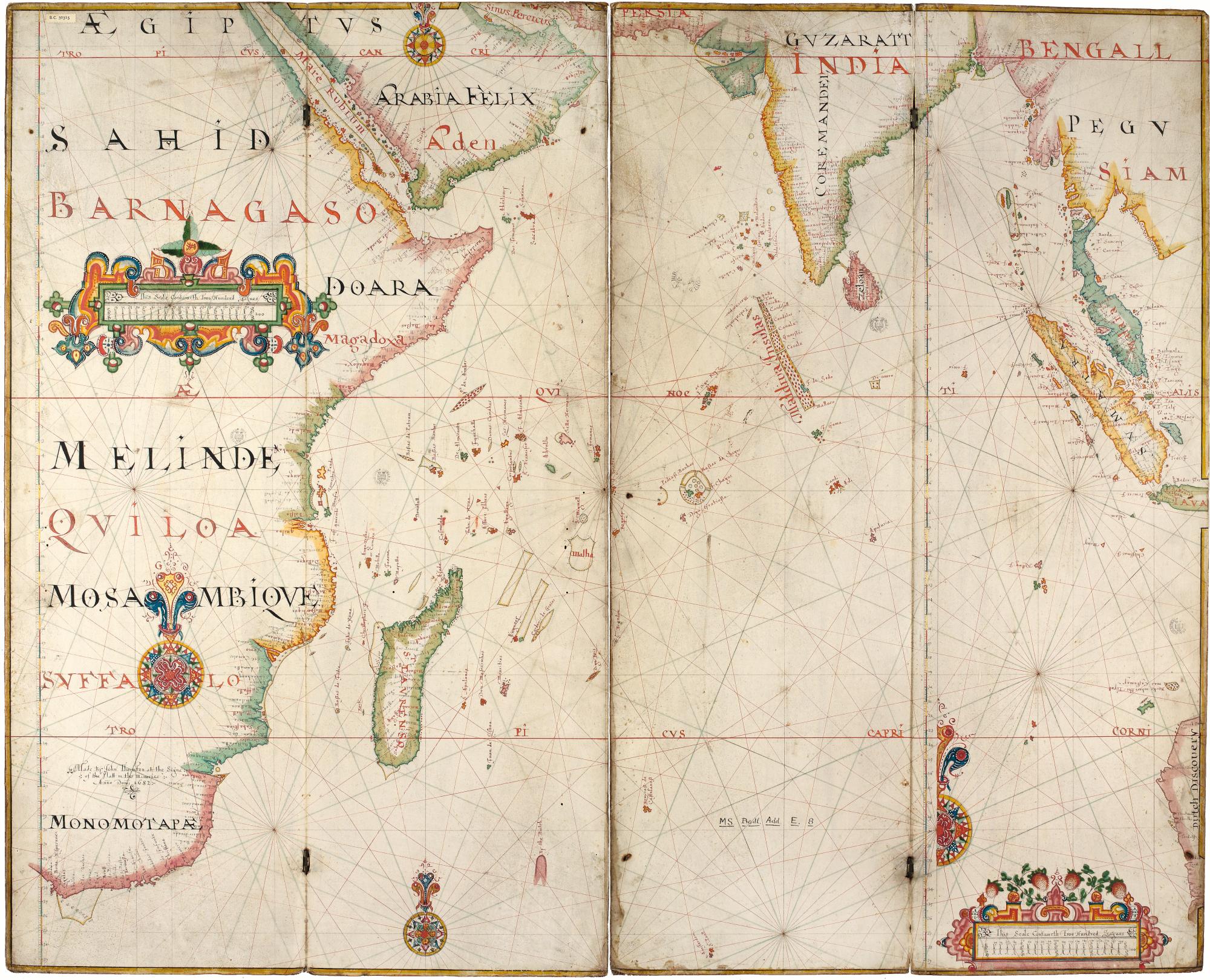 This lovely decorative chart is by John Thornton, an English chartmaker of the Thames School. It is an unusually late example of a portolan chart. Thornton was Hydrographer to the East India Company and produced many maps, both manuscript like this one and printed.