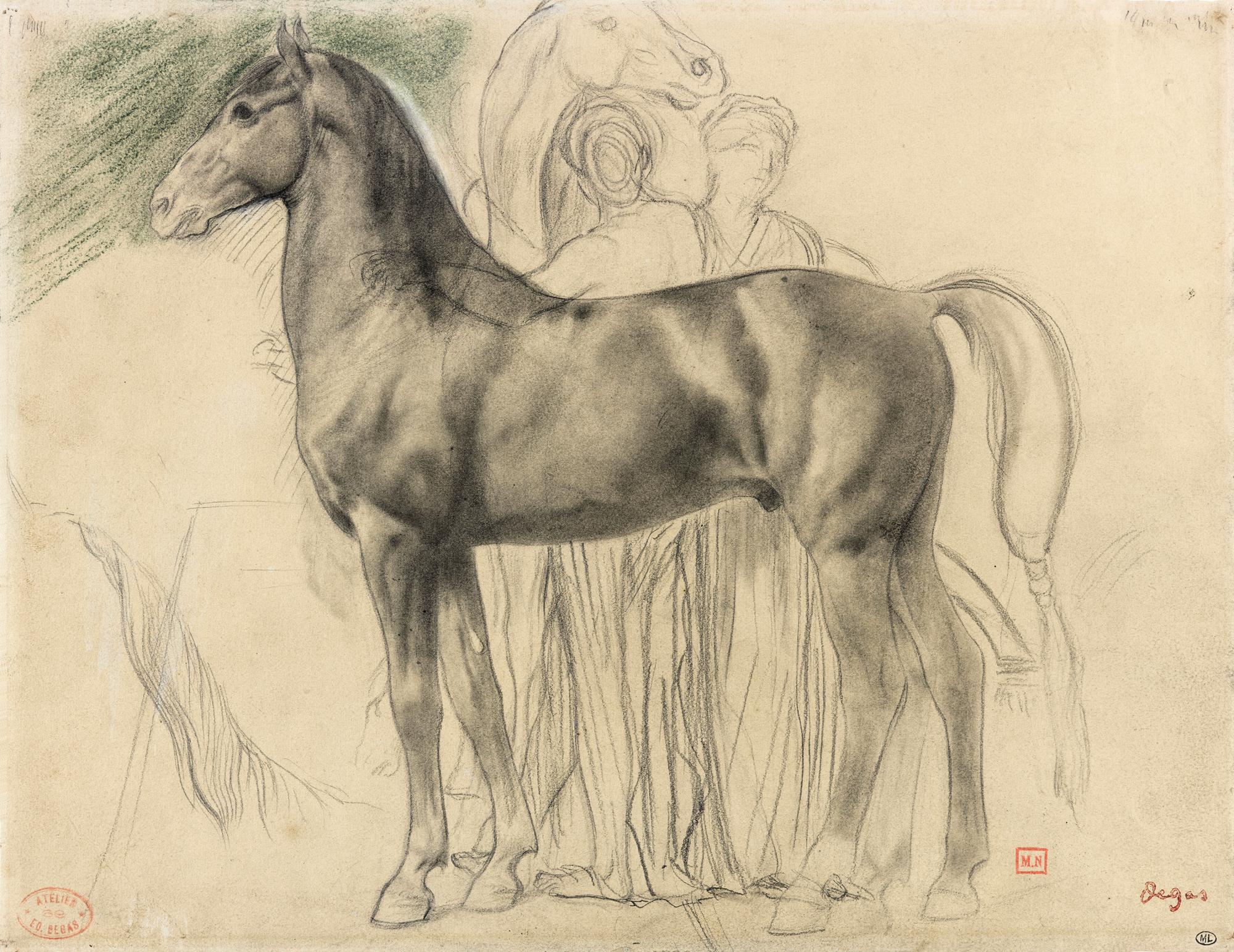 Museoteca - Cheval de profil à gauche et deux femmes retenant un cheval, étude pour Sémiramis construisant Babylone, Degas, Edgar