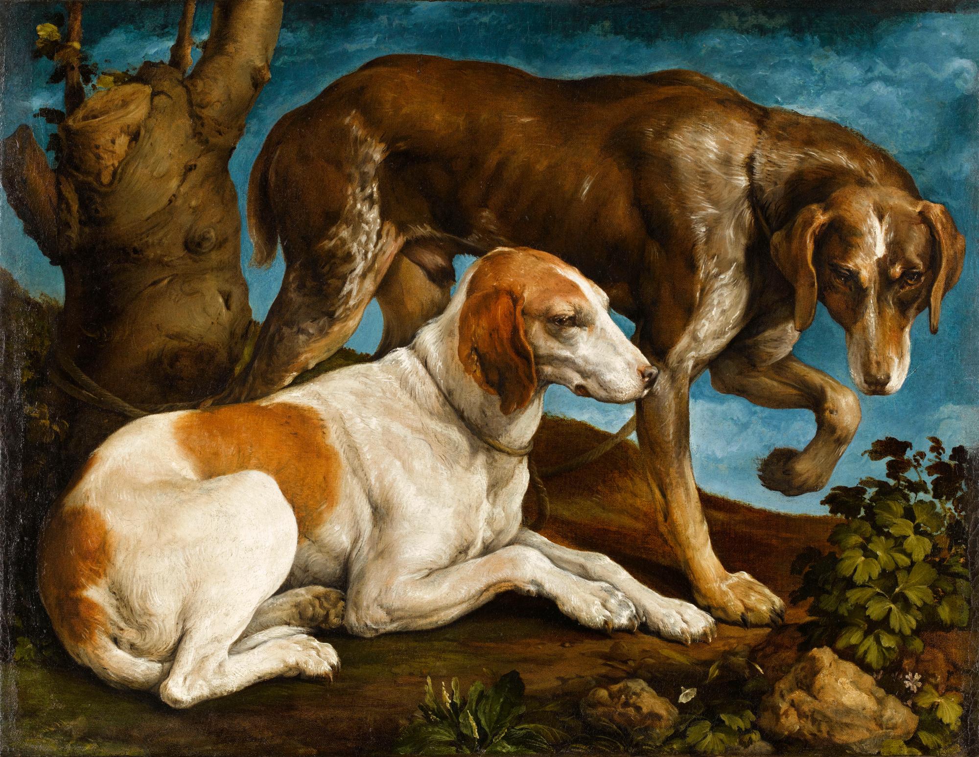 Museoteca - Deux chiens de chasse attach?s ? une souche, Bassano, Jacopo da Ponte