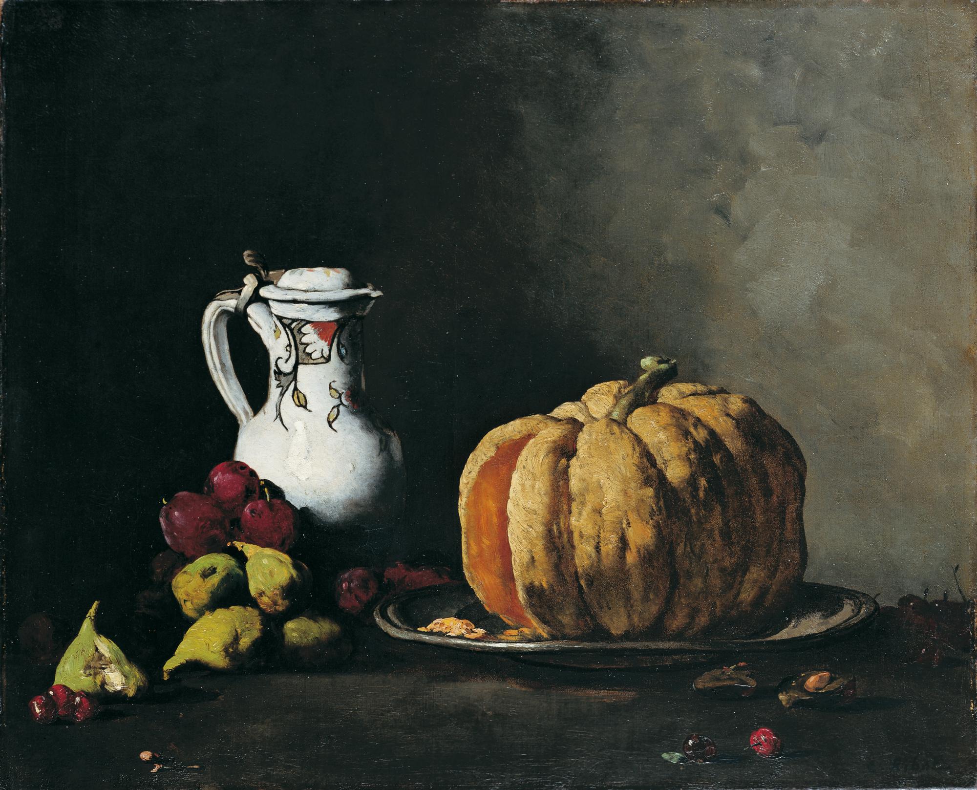 Museoteca - Naturaleza muerta con calabaza, ciruelas, cerezas, higos y jarra, Ribot, Théodule-Augustin