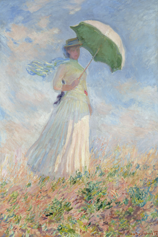 Essai de figure en plein air: femme à l'ombrelle tournée vers la droite