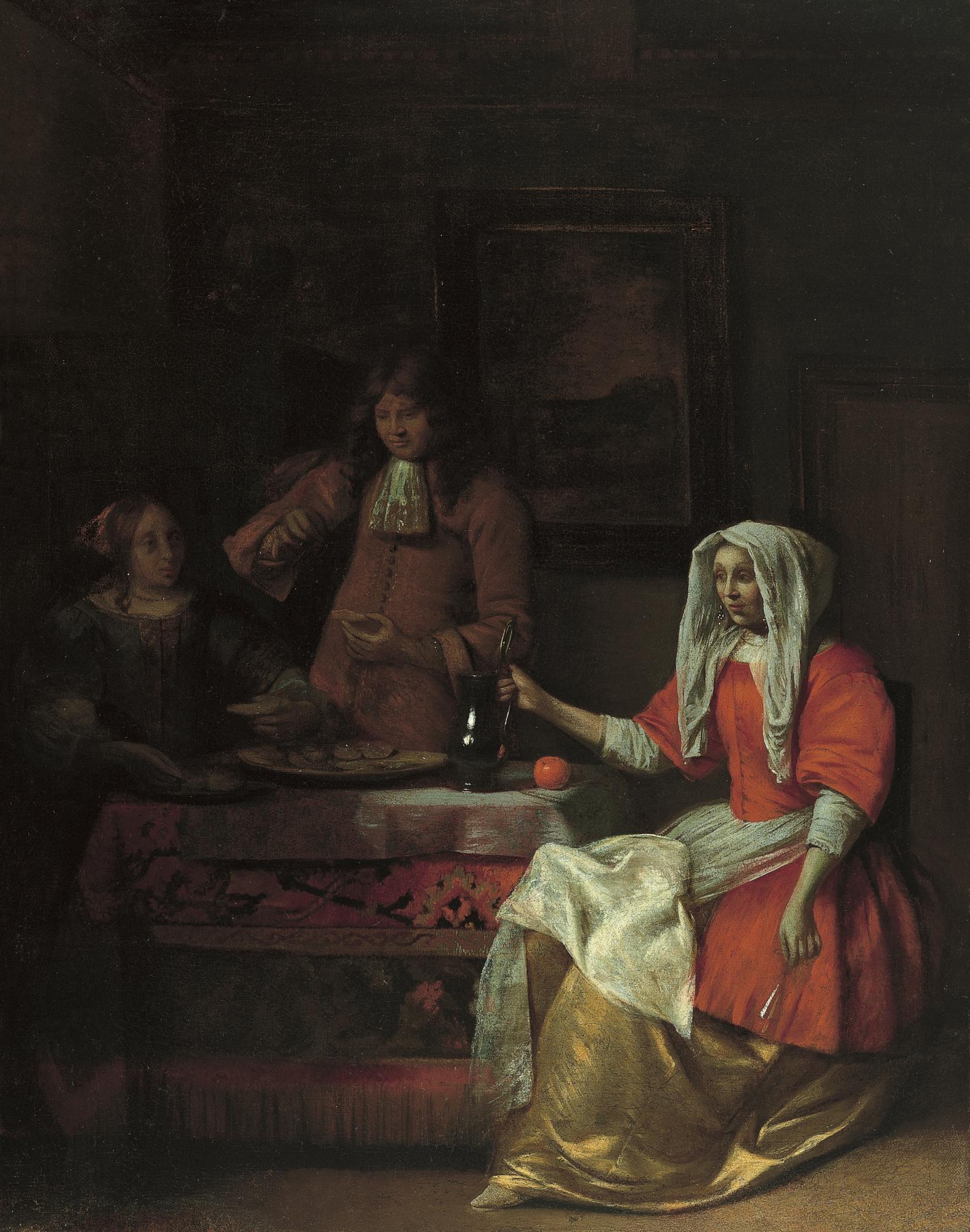 Museoteca - Interior con dos mujeres y un hombre bebiendo y comiendo ostras, de Hooch, Pieter Hendricksz