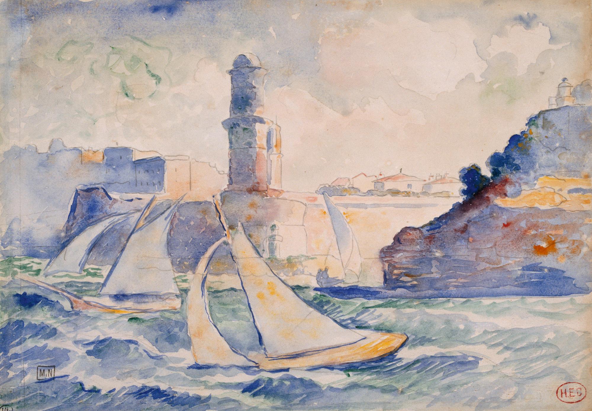 Museoteca - Entr?e d'un port (Antibes) avec au premier plan deux voiliers et ? l'arri?re plan un phare, Cross Henri Edmond (dit), Delacroix H. E.