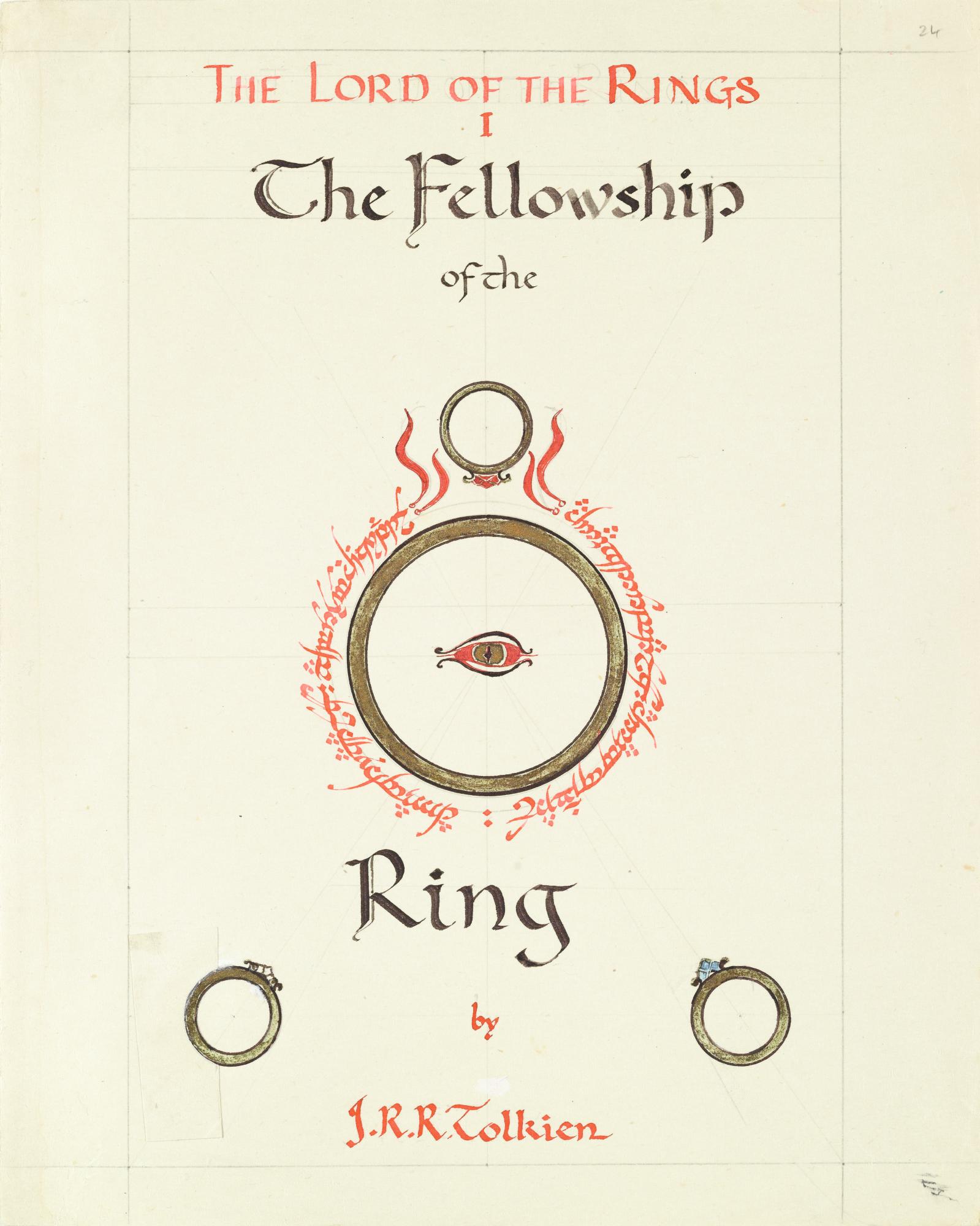 This is one of five different dust jacket designs that Tolkien drew for the first volume of The Lord of the Rings. The One Ring featured prominently in all the designs, here opposed by the three Elven rings. MS. Tolkien Drawings 90, fol. 24. Reproduced with kind permission of The Tolkien Estate Limited for the Bodleian Libraries exhibition Tolkien: Maker of Middle-earth.