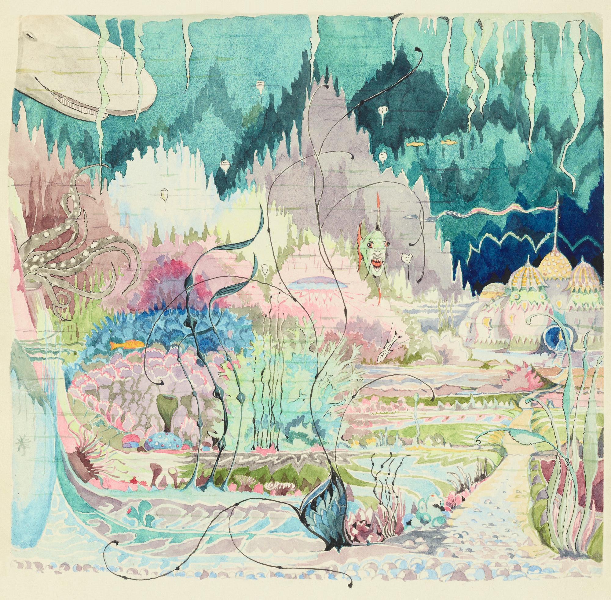 By 1927 Tolkien's growing family of three young sons had sent his imagination in the direction of children's stories. A family holiday in Filey on the North Yorkshire coast was marred by the loss of Michael's toy dog on the beach. To calm the children during a particularly stormy night in their cliff-top lodgings, he told them the story of a real dog Rover, who was changed into a toy dog by a passing wizard. Rover had many subsequent adventures including a sojourn under the sea in the Merking's palace before being restored to his true form and to his loving family. The bedtime story told to his children was published posthumously in 1998, as Roverandom. MS. Tolkien Drawings 89, fol. 4. Reproduced with kind permission of The Tolkien Estate Limited for the Bodleian Libraries exhibition Tolkien: Maker of Middle-earth.